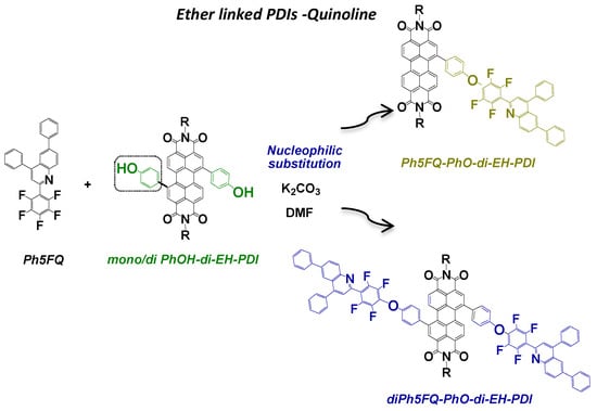 In the next step, in order to connect the PDI with the perfluorophenyl quinoline group a facile, metal-free way was investigated. Taking advantage of the highly reactive perfluorophenyl group under basic conditions [], PhOH-di-EH-PDI and diPhOH-di-EH-PDI molecules reacted with the “para” fluorine atom of phenyl perfluorophenyl quinoline under typical basic conditions of nucleophilic substitution as shown in Scheme 3. Br-5FQ was replaced with the phenyl perfluorophenyl quinoline moiety (Ph5FQ) in order to have a single reactive site. The isolation of ether based Ph5FQ-PhO-di-EH-PDI and diPh5FQ-PhO-di-EH-PDI molecules was achieved after purification with column chromatography in good yields up to 80%.