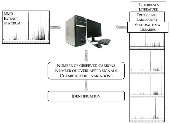 13C-NMR analysis of triterpene mixtures has been done following a computerized procedure initiated and developed at the University of Corsica. This experimental procedure was successfully employed for identifying and quantifying neutral triterpenes and triterpene acids in a dichloromethane extract of cork (Quercus suber) [], and in a hexane extract from leaves of Olea europea []. In short, identification of the components was carried out by comparing chemical shift values in the mixture spectrum with those of reference spectra compiled in two libraries devoted to triterpenes, using in-house software (Figure 1). The first spectral data library was constructed with spectra recorded in the laboratory while the second one was built with spectral data picked up in recent literature (spectra recorded with diluted samples). Each compound was identified by taking into account three parameters that were directly available from the computer program: (i) the number of observed signals with respect to what was expected, (ii) the difference between the chemical shift of each signal in the mixture and in the reference (Δδ), and (iii) the number of overlapping signals of carbons belonging to two components that fortuitously possess the same chemical shifts [,]. If necessary, the occurrence of “false positive” could be avoided by taking into account the relative intensities of the non-overlapped signals of protonated carbons of a given component. A component is considered identified if 50% of its signals are observed and they belong to that compound.