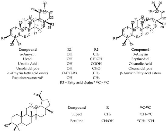 Both extracts (hexane and dichloromethane) as well as all the fractions of CC were analyzed by 13C-NMR, following a computerized procedure developed at the University of Corsica (see results) [,]. Neutral triterpenes and triterpene acids were identified by comparing their carbon chemical shifts with those of references compiled in the in-house library (which contains about 50 compounds bearing steroidal structures or pentacyclic structures of oleanane, ursane, or lupane families and that is continuously enriched) or literature data (about 550 compounds). Carbon chemical shifts of amyrin fatty acid esters were compared with literature data [,]. Fatty acid methyl esters were analyzed by GC (FID), GC-MS, and 13C-NMR by comparing retention indices (RIs), mass spectra, and carbon chemical shifts with those of references compiled in the in-house libraries or literature data.