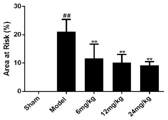 Sal B significantly reduced the infarct area of rats (n = 6 rats). TTC staining was used to evaluate the myocardial infarct size of each rat. Data were expressed as mean ± SD. ** p < 0.01 vs. Model group, ## p < 0.01 vs. Sham group.