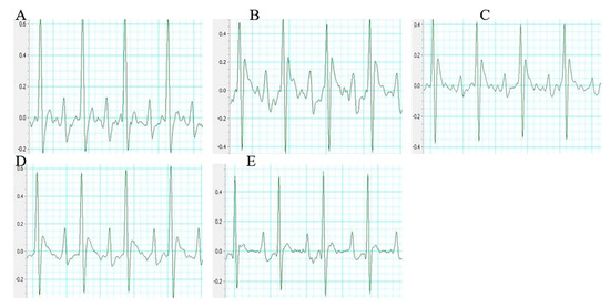 Representative electrocardiogram of each group (n = 10 rats). (A) Sham group (B) Model group (C) Sal B (6 mg/kg) (D) Sal B (12 mg/kg) (E) Sal B (24 mg/kg).
