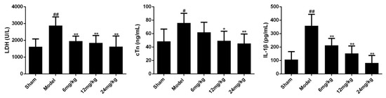 The elevation of cardiac markers (such as LDH, cTn) and inflammatory cytokines (such as IL-1β) are important bases for the diagnosis of myocardial ischemia injury. To evaluate the efficacy of Sal B on myocardial ischemia, the expression levels of LDH, cTn and IL-1β in serum were determined. Results showed that myocardial ischemia resulted in significant increases in the levels of LDH, cTn and IL-1β (Figure 4). However, treatment with Sal B (6, 12, 24 mg/kg) remarkably alleviated these conditions.