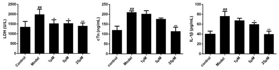 Effects of Sal B on LDH/cTn/IL-1β in cell supernatant (n = 3). Data were expressed as mean ± SD. * p < 0.05, ** p < 0.01 vs. Model group, ## p < 0.01 vs. Control group.