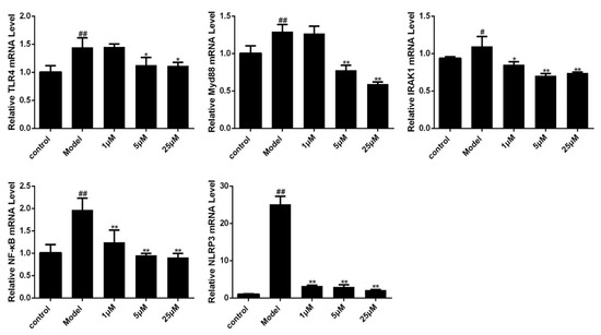 Effects of Sal B on TLR4/Myd88/IRAK1/NF-κB/NLRP3 mRNA levels in H9C2 as detected by fluorescence quantitative PCR (n = 3). Data were expressed as mean ± SD. * p < 0.05, ** p < 0.01 vs. Model group, # p < 0.05, ## p < 0.01 vs. Control group.