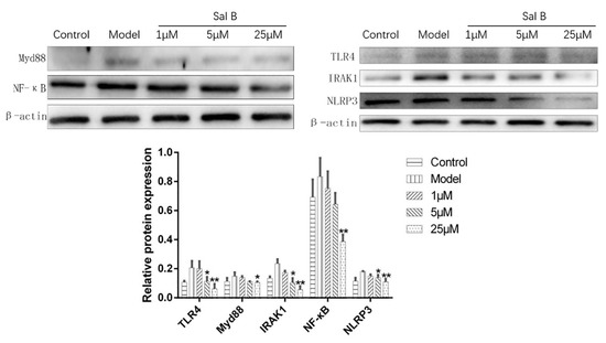 Effects of Sal B on TLR4/Myd88/IRAK1/NF-κB/NLRP3 protein expression levels in each group (n = 3). Expression was normalized to β-actin, data were expressed as mean ± SD of three independent experiments (n = 3). * p < 0.05, ** p < 0.01 vs. Model group.