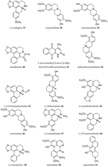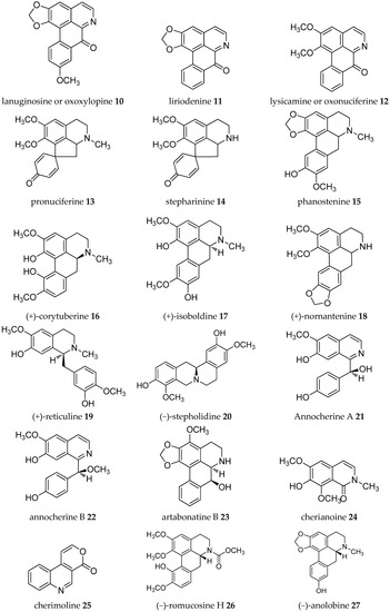 Acetogenins from the Annona genus were reviewed together with other genus in the same family Annonaceae [8,19,20,21,22,23], which covered the isolation, molecular properties, and biosynthesis of their pharmacological activities. Here, we collected records on alkaloids which were isolated in the Annona plant genus from 1960–2019 (Table 1). The alkaloids present have been of interest since the first, annonaine (8, Figure 2), was isolated in 1931 from the stem bark of Annona muricata L. collected in the Philippines [24]. Table 1 shows the alkaloids isolated from the specific plants of each species and their structures are presented in Figure 2.