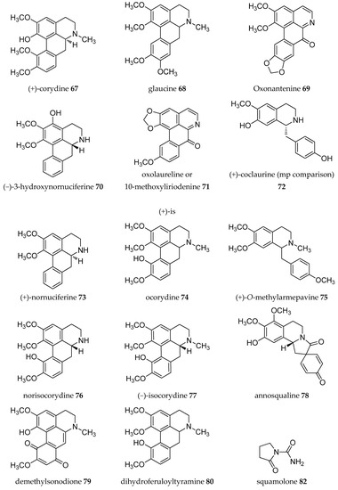 In addition to the above antiprotozoal and antimicrobial activities, both the crude extracts from annona plants and the individual alkaloids have shown potent anticancer/antitumour activities.Many crude extracts of Annona species showed significant anti-cancer activities, but most of the bioactive constituents present in those crude extracts were acetogenins, fatty acids, and peptides [7]. However, wherever studied, it was known that some aporphine alkaloids, especially (−)-roemerine 49, which was isolated from the leaves of the wild custard apple, improved the response produced by vinblastine against multidrug-resistant KB-V1 or KB-3 cells (ED50 > 20 µg/mL). This alkaloid appears to function by interacting with P-glycoprotein in the multidrug-resistant KB-V1 cell membrane vesicles [59]. The leaves of Annona muricata also showed potency to reduce gastric lesion, to expel parasitic worms and, moreover, the crude extract from the bark possessed anti-viral activity against herpes simplex virus type 1. The extracts and compounds also showed anticancer activities against breast cancer. Alkaloids, (−)-coclaurine 55, (+)-reticuline 19, argentinine 52, atherosperminine 54, and (+)-xylopine 65 were isolated from the root of Indonesian Annona muricata in which (−)-coclaurine 55, (+)-reticuline 19 were non-toxic against a human suspension cancer cell line (HL-60 leukemia cells) and two fibroblastic cell lines (A549 lung cancer cells and HepG2 liver cancer cells). (+)-Xylopine 65 exhibited the lowest IC50 value ranging from approximately 20–80 µM [18].The alkaloid isocoreximine 39 isolated from Annona cherimola, at concentration of 50 µg/mL indicated cytotoxicity against K-562, U-251, PC-3, HCT-15, and MCF-7 with % inhibition of cell viability 94.15%, 65.23%, 78.71%, 63.05%, and 85.76%, respectively. Isocoreximine 39 showed in vitro cytotoxic activity against K-562, U-251, PC-3, HCT-15, and MCF-7 with % of inhibition of cell viability 94.15%, 65.23%, 78.71%, 63.05%, and 85.76%, respectively [34].