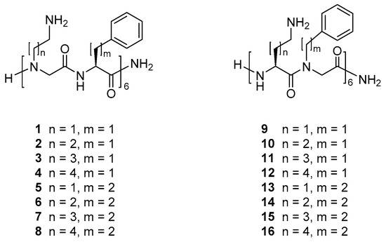 The investigated peptidomimetics (see Figure 1) may be considered to comprise two main groups, consisting either of alternating cationic peptoid residues and hydrophobic amino acid residues (i.e., 1–8) or of alternating cationic amino acid residues and hydrophobic peptoid residues (i.e., 9–16). Four different lengths of the cationic side chains and two different lengths of the hydrophobic side chains were selected in order to obtain analogues within a sufficiently wide range of hydrophobicity so that the entire series was expected to comprise compounds with a substantial variation in antibacterial and/or hemolytic properties. Analogues displaying further extended hydrophobic side chains were not included since analogous peptide/β-peptoid hybrids were found to be poorly soluble in the test media and were found to be devoid of cell selectivity [55].