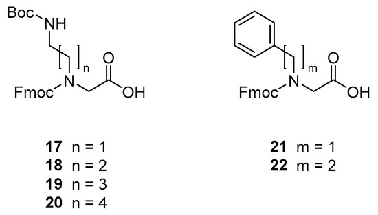 The peptidomimetics were synthesised by using Fmoc-based solid-phase peptide synthesis (SPPS) methodology for assembly of commercial amino acid and preformed peptoid building blocks (i.e., 17–22). The Fmoc-protected peptoid building blocks were prepared essentially as previously described [30,56]: The primary amine corresponding to the desired side chain was alkylated with ethyl 2-bromoacetate or tert-butyl 2-bromoacetate to provide an intermediate that subsequently was hydrolysed and Fmoc-protected to yield the desired peptoid building block (see Figure 2). Importantly, the cationic peptoid building blocks 17–20 could all be obtained in pure state on a multigram scale via an extraction work-up process followed by crystallisation.