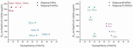 For subgroup II (i.e., 5–8) there is a clear trend of an increasing effect on cell viability within the subseries NLys → NOrn → NDab (see Table 2.). For subgroup II further extension of the cationic side-chain length (from NLys in 7 to NhLys in 8) confers a slightly increased hydrophobicity due to incorporation of additional six methylene groups. This leads to a significantly increased effect of 8 on cell viability, corresponding to a ca. 2.7-fold lowering of the IC50 value as compared to that found for 7. In subgroup II, the most hydrophobic analogue (i.e., 5) was the only representative giving rise to >10% hemolysis at 800 µg/mL.
