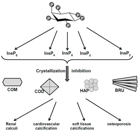 The in vivo functions of InsP6 and the products that result from its dephosphorylation (InsP5, InsP4, InsP3, and InsP2) are similar to those of pyrophosphate and bisphosphonates, in that they are potent inhibitors of the formation of calcium oxalate and calcium phosphate crystals (Figure 1).