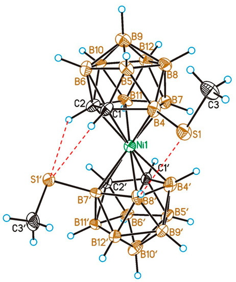 Single-crystal X-ray diffraction study of the tetrabutylammonium salt of the meso-diastereomer (Bu4N)[4,7′-(MeS)2-3,3′-Ni(1,2-C2B9H10)2] revealed that it is isostructural with the corresponding iron [19] and cobalt [18] complexes. Similarly to the corresponding derivatives of iron(III) and cobalt(III) bis(dicarbollides), the dicarbollide ligands in the [4,7′-(MeS)2-3,3′-Ni(1,2-C2B9H10)2]− anion adopt gauche configuration stabilized by two CH···S and one BH···S intramolecular contacts (Figure 3).