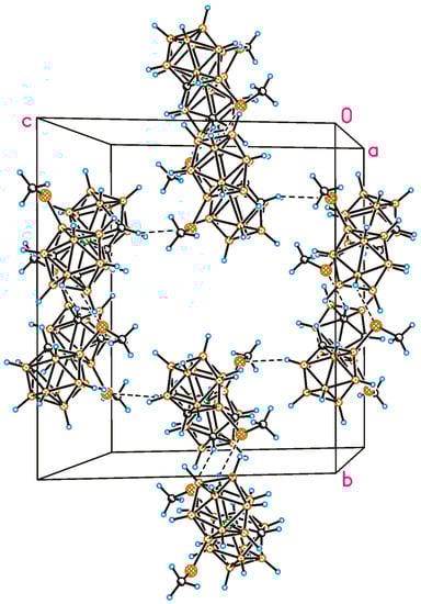 An asymmetric unit cell consists of one cation and one anion. Crystal packing of (Bu4N)[4,7′-(MeS)2-3,3′-Ni(1,2-C2B9H10)2] is also built up of alternate cationic and anionic layers (Figure S5). However, in contrast to (Bu4N)[8,8′-(MeS)2-3,3′-Ni(1,2-C2B9H10)2], layers in (Bu4N)[4,7′-(MeS)2-3,3′-Ni(1,2-C2B9H10)2] adopt corrugated shape, and cationic layers penetrate into anionic ones. Also, in contrast to (Bu4N)[8,8′-(MeS)2-3,3′-Ni(1,2-C2B9H10)2], stabilization of anionic layers in (Bu4N)[4,7′-(MeS)2-3,3′-Ni(1,2-C2B9H10)2] is provided by significant contribution of weak Ccarb–H···S hydrogen bonds (Figure 4).