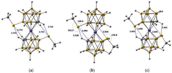 DFT-optimized structures of methylsulfanyl derivatives of nickel(III) bis(dicarbollide): (a) [8,8′-(MeS)2-3,3′-Ni(1,2-C2B9H10)2]− isomer; (b) [4,7′-(MeS)2-3,3′-Ni(1,2-C2B9H10)2]− isomer; and (c) [4,4′-(MeS)2-3,3′-Ni(1,2-C2B9H10)2]− isomer.