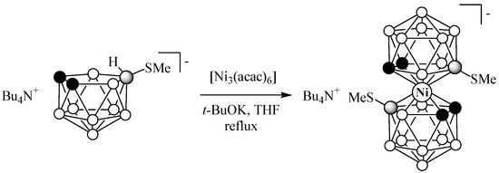 All reactions were performed in an inert nitrogen atmosphere while using standard Schlenk techniques. (Bu4N)[10-MeS-7,8-C2B9H11], (Bu4N)[9-MeS-7,8-C2B9H11], and [Ni(acac)2]3 were prepared as described in the literature [42,43,44]. Anhydrous tetrahydrofuran was prepared by using the standard procedure [45]. Acros Organics silica gel (0.060–0.200 mm) was used for column chromatography. Thin-layer chromatograms (DC Kieselgel F254 silica gel on aluminum plates, Merck) were visualized, using 0.1% PdCl2 in 3 M of HCl(aq). The 11B NMR spectra at 128.4 MHz were recorded with a Bruker Avance-400 spectrometer (Bruker Biospin AG, Fällanden, Switzerland) and referenced by using BF3∙Et2O as the external standard. High-resolution mass spectra (HRMS) were measured on a Bruker micrOTOF II instrument (Bruker Daltonics, Bremen, Germany), using electrospray ionization (ESI). The measurements were done in a negative ion mode (3200 V); mass range from m/z 50 to m/z 3000; external or internal calibration was done with ESI Tuning Mix, Agilent (Santa Clara, CA, USA). A syringe injection was used for solutions in acetonitrile (flow rate 3 mL/min). Nitrogen was applied as a dry gas; the interface temperature was set at 180 °C.