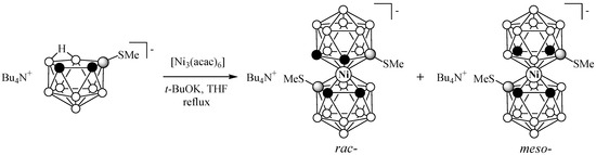 The similar reaction of [Ni3(acac)6] with unsymmetrically substituted methylsulfanyl derivative of nido-carborane (Bu4N)[9-MeS-7,8-C2B9H11] results in the mixture of rac-(Bu4N)[4,4′-(MeS)2-3,3′- Ni(1,2-C2B9H10)2] and meso-(Bu4N)[4,7′-(MeS)2-3,3′-Ni(1,2-C2B9H10)2] (Scheme 2).