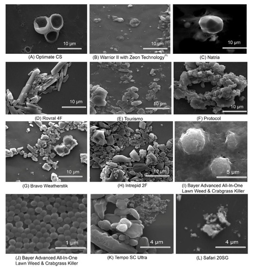 Scanning electron photographs of various pesticides and pesticide formulations: (A) Optimate CS; (B) Warrior II with Zeon Technology; (C) Natria; (D) Rovral 4F; (E) Tourismo; (F) Protocol; (G) Bravo Weatherstik; (H) Intrepid 2F; (I) and (J) Bayer Advanced All-In-One Lawn Weed & Crabgrass Killer. A larger structure appears to enclose small particles (I); the smaller particles (J) were also observed separately; (K) Tempo SC Ultra and (L) Safari 2SG. Scale has been indicated in the figure plate. Commercially available pesticides in Figure 4 were obtained from local retail establishments, agricultural chemical suppliers, or distributors. Samples were serially diluted with water and pipetted onto a silica substrate, in order to best visualize individual particles. Imaging was done at the Oregon State University Electron Microscopy Center using Quanta 600 FEG Scanning Electron Microscope (Thermo Fisher Scientific, Hillsboro, OR, USA).