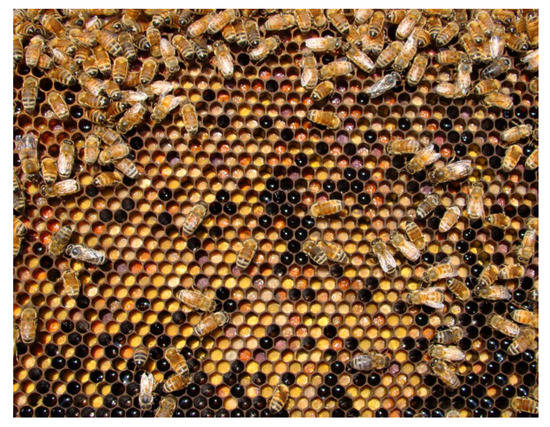 Direct contact with some insecticides can kill bees in the field. Controlled release NBP formulations could protect bees from immediate exposure, but enable them to transport particles, leading to delayed risk to the colony. Complex mixtures of pesticides are commonly found in bees, nectar and honey, pollen, bee bread (Figure 7) and beeswax [133]. Pesticide residues transported with pollen are of increasing concern, due to the importance of this sole protein source in larval development [134]. The final instars of honey bee larvae are fed small quantities of pollen directly, and also the nurse bees consume significant quantities of pollen to produce brood food for the developing larvae [135]. Due to long-range foraging of bees, the majority of hive materials, even when the hives are near organically managed crops or remote areas are contaminated with pesticides. The evolution of pesticide active ingredients, improved sample preparation, and analysis methods would make it difficult to make historical comparisons [136]. Laboratory and field studies are needed to investigate whether NBP formulations increase the accumulation of any given pesticide in hive matrices.