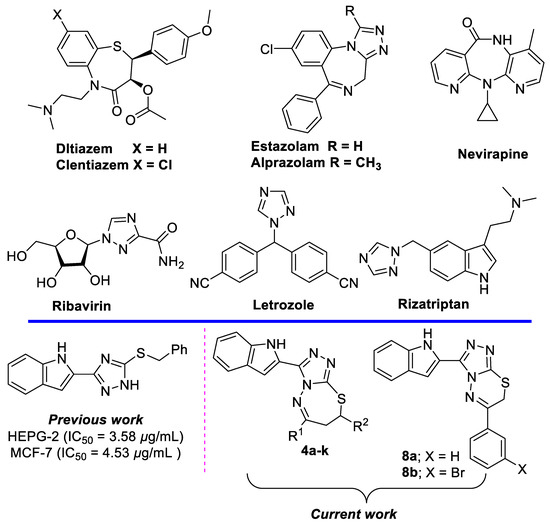 Selected drugs containing benzothiazepine, benzodiazepine, 1,2,4-triazole and indole scaffolds, and our designed new compounds.