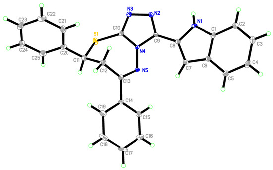 Compound 4a fortunately was obtained in a single crystal, which was solved using X-ray single crystal diffraction [20,21]. Table S1 lists the crystallographic data collection and structure refinement features. The later compound crystalized in a space group, a = 10.1159 (11) Å, b = 10.6507 (11) Å, c = 10.9680 (12) Å, α = 95.737 (3)°, β = 116.290 (3)°, γ = 100.618 (3)°, V = 1018.99 (19) Å3 and triclinic crystal system with P−1. Table S2 describes some bond angles and selected interatomic distances. The unit cell of the titled compound contained one molecule which appeared in the unit cell, showing that all bond angles and bond lengths of the benzene rings were in the ordinary framework. The indole ring (C1-C8/N1) formed a dihedral angle of 15.35° with the triazole ring (C9/N2/N3/C10C4)). The structural feature of 4a as depicted in Figure 2 shows an imine functionality, and the C13=N5 bond is [1.296 (5) (15) Å]. In the molecular packing (Figure S1), molecules were connected via strong classical intermolecular hydrogen bonds N1—H1N1···N2i (Table S3).