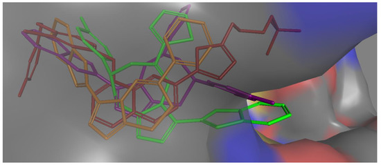 Molecular surface representation of compound 4b purple, compound 4j green, compound 8a brown, and co-crystallized ligand (red) in EGFR active site (front view).
