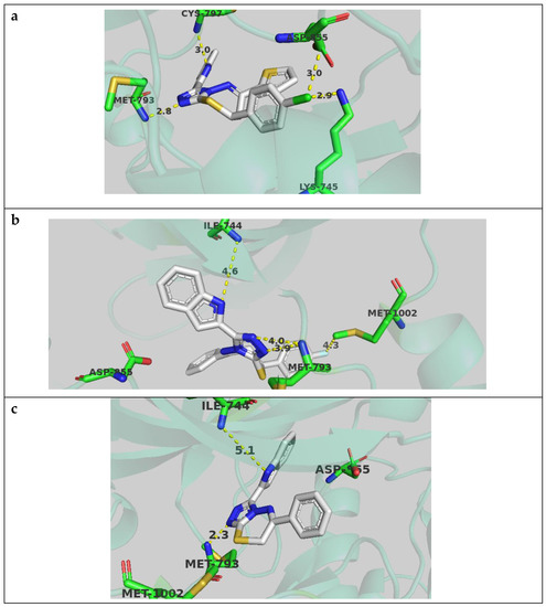 Compound 4j docked well in the active site and showed an important hydrogen bond with the key Met 793 residue, with the triazole anchor at a distance of 2.8 angstrom. The p-chlorophenyl ring occupied the hydrophobic pocket and formed a dipole–dipole interaction with Lys 745 side chain. The indole ring was positioned well in the cleft region and formed a hydrogen bond with Cys 797 (Figure 5a).