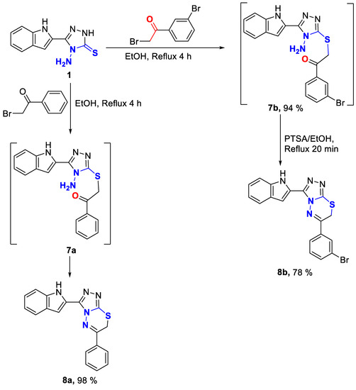 A mixture of 4-amino-1,2,4-triazole-3-thione derivative 1 (1.0 mmol) and the relevant phenacyl bromide (1.1 mmol) was refluxed for 4 h in 10 mL ethanol and left to cool to room temperature. The formed ppt was collected by filtration, dried and recrystallized from DMF/EtOH to give 8a, and 7b respectively.