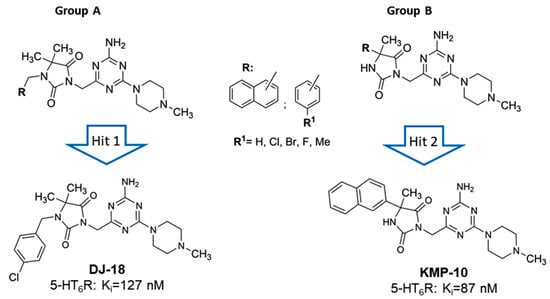 General structures of two series of 1,3,5-triazine hydantoin 5-HT6R agents found, Group A and Group B, with respective “hits:” DJ-18 and 3-((4-amino-6-(4-methylpiperazin-1-yl)-1,3,5-triazin-2-yl)methyl)-5-methyl-5-(naphthalen-2-yl)imidazolidine-2,4-dione (KMP-10).