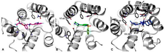 In general, all docked compounds shared a common set of interactions with the 5-HT6 receptor, i.e., the salt bridge with D3.32 and CH- π with F6.52. Due to differences in the structure of these ligands (topologies), they showed different binding modes. Idalopirdine (Figure 3A, magenta) represented an extended conformation, where fluoroalkyl chain lied in proximity to asparagine N2.63 (enabling the formation of a hydrogen-bond type of interaction) and aspartic acid D7.35 (in which it can form multipolar orthogonal type of interactions). SUVN-502 (Figure 3B, green) shows a representative binding mode of 5-HT6 antagonists [12,17,20], where the 2-Br substituted at the aryl ring was pointed (through the sp3 hybridization of sulfonamide linker) to a hydrophobic cavity formed by helixes 3–5. A slightly different way of interaction from Idalopiridine and SUVN-502 with the 5-HT6 receptor showed KMP-10 (Figure 3C, blue). The hydantoin ring formed an additional hydrogen bond with N6.55, which resulted in the anchoring of this fragment in place and the turning of the terminal naphthalene ring towards the extracellular part of the receptor.