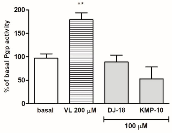 The effect of verapamil (VL) and 5-HT6R ligands on P-glycoprotein (Pgp) basal activity (basal). Statistical significance (** p < 0.01) was analyzed by Graph Pad PrismTM 6 software using a one-way ANOVA and Bonferroni’s multiple comparison post-hoctest. The compounds were examined in triplicate.