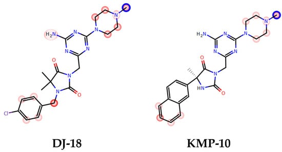 In silico prediction of the sites of metabolism by MetaSite 6.01 for KMP-10 and DJ-18. Blue circle marked on the functional group structures indicates the highest biotransformation probability. The fading red color shows the decreasing of the metabolism probability.
