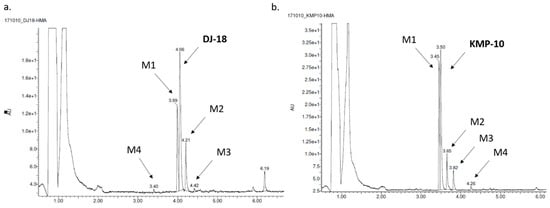 The UPLC spectra of the reaction mixtures after 120 min incubation of DJ-18 (a) and KMP-10 (b) with human liver microsomes (HLMs).