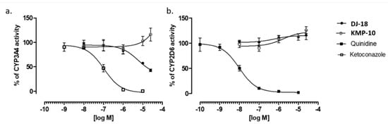 Effect of reference inhibitor (ketoconazole), KMP-10 and DJ-18 on CYP3A4 activity (a). Effect of reference inhibitor quinidine, KMP-10 and DJ-18 on CYP2D6 activity (b). The compounds were examined in triplicate.