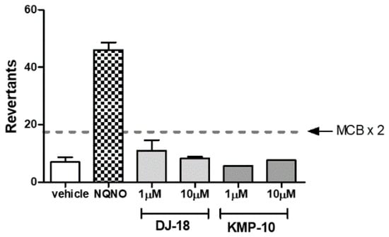 The number of revertants of the Salmonella typhimurium TA100 strain exposed to the reference mutagen nonyl-4-hydroxyquinoline-N-oxide (NQNO, 0.5 µM) and 5-HT6R ligands in two concentrations of 1 and 10 µM. The dashed line marks the doubled medium control baseline (MCB). The compounds were examined in triplicate.