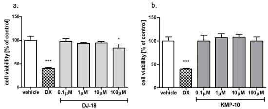 The effect of reference cytostatic drug doxorubicin (DX, 1 µM), DJ-18 (a) and KMP-10 (b) on the viability of HepG2 cell line. DMSO 1% in cell growth media (vehicle) was used as a control. Statistical significance (*** p < 0.001, * p < 0.05) was analyzed by Graph Pad PrismTM 6 software using a one-way ANOVA and Bonferroni’s multiple comparison post-hoc test. The compounds were examined in quadruplicate.