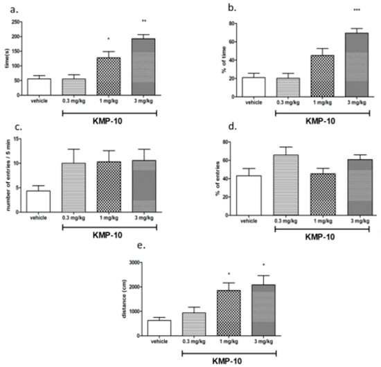 Anxiolytic-like effects of KMP-10 in the elevated plus-maze (EPM) test. Increased open-arm exploration denotes reduced anxiety. KMP-10 was intraperitoneally (i.p.) injected 60 min before the test. Values represent the mean ± SEM of the time (a) and percentage of time (b) spent in open arms, entries (c) and percentage of entries (d) distance traveled in the open arms during the five-minute test session (e) compared to the respective vehicle group. * p < 0.05, ** p < 0.01, ***p < 0.001 (ANOVA was followed by the Bonferroni’s post-hoc test), and N = 7–8.