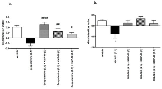 KMP-10 at the full dose-range (0.3–3 mg/kg) significantly and dose-dependently reversed the memory deficits induced by scopolamine in the novel object recognition (NOR) test, while during the memory impairment induced by MK-801, some activity at the dose of 1 mg/kg of KMP-10 was observed, but the discrimination index did not reach a statistically significant level (Figure 11).