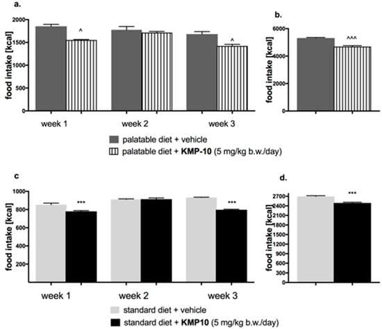 Effect of long-term administration of KMP-10 on food intake in male Wistar rats (a). Food intake by male Wistar rats fed with palatable diet in particular weeks (b). Sum of food intake by male Wistar rats fed with palatable diet (c). Food intake by male Wistar rats fed with standard diet in particular weeks (d). Sum food intake by male Wistar rats fed with standard diet. Results are mean data for two animals housed together, n = 8. ^ Comparisons vs. the vehicle-treated control group fed palatable diet; * comparisons versus the vehicle-treated control group fed standard diet, the two-way ANOVA (a,c) and the Student’s t-test (b,d); ^^, ** p < 0.01; and ^^^, *** p < 0.001.