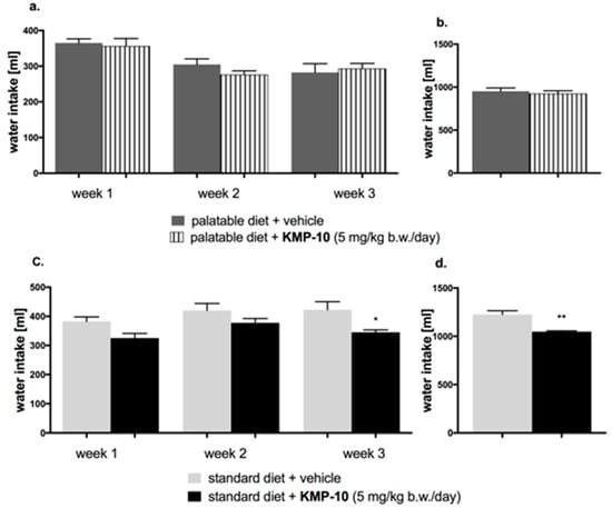 Starting from the first week of the experiment, KMP-10 i.p. administered at a dose of 5 mg/kg b.w. significantly reduced the amount of calories consumed by the animals in the test group as compared with the control group. Results are shown in Figure 12c,d. A significantly lower water intake in the tested groups as compared to the control group was also observed (Figure 13c,d).