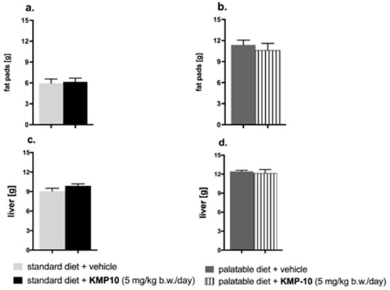 Effects of long-term administration of KMP-10 on amount of peritoneal fat (a,b) and liver weight (c,d) in male Wistar rats. Results are means ± SEM, n = 8. Comparisons were performed by a Student’s t-test.