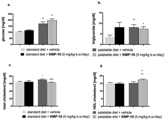In animals fed with the palatable feed, the blood glucose level and blood triglyceride level were significantly higher than those in the control group fed the standard feed; results are shown in Figure 15a,b. KMP-10, at a dose of 5 mg/kg b.w., significantly decreased the total cholesterol in blood in comparison to the group fed the palatable feed (Figure 15c) and significantly increased HDL (high density lipoprotein) cholesterol (Figure 15d).