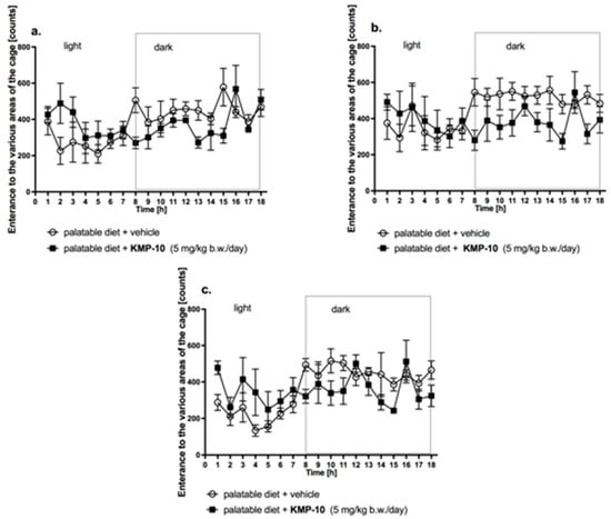 Changes in the spontaneous activity after single (a) and fourteen (b) and twenty (c) day administration of KMP-10 to rats fed palatable diet. Results are mean ± SEM; n = 8, comparisons versus the vehicle-treated excessive eating control groups (two-way ANOVA).