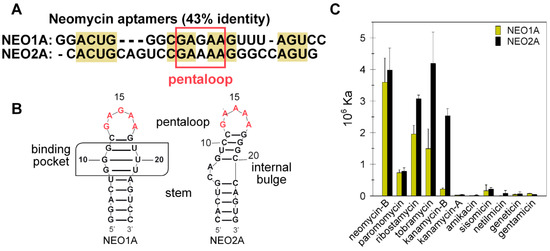 Although NEO2A shares only 43% sequence identity with NEO1A (Figure 1A), both aptamers are predicted by RNAstructure software [30] to form a stem (Figure 1B). Both aptamers bound aminoglycosides (Figure S1) consisting of three and four rings (Figure 1C) with higher affinities for the four-ring neomycin-B than for paromomycin. However, the aptamers differ in their specificities for the three-ring aminoglycosides with NEO1A binding tobramycin with lower affinity compared with kanamycin-B, whereas NEO2A bound the tobramycin and kanamycin-B with similar affinities (Figures S2, S3 and S4). These results showing similar, although not identical, affinities and specificities of NEO1A and NEO2A, suggested that these aptamers might interact similarly with aminoglycosides.