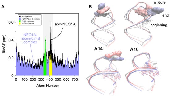 Comparison of root mean square fluctuations (RMSFs) from molecular dynamics simulations of apo-NEO1A and NEO1A with bound ligand. (A) Comparison between the RMSFs of the apo-aptamer (black) and aptamer–ligand complex (blue) simulations showed the pentaloop (light-gray rectangle) as the most flexible segment of NEO1A with the largest RMSF differences in A16 (yellow) compared with less difference in mobility of A14 (green). (B) Representative frames from the MD simulations for beginning (white), middle (red), and end (blue) are overlaid and are shown both for A16 and A14 movements.