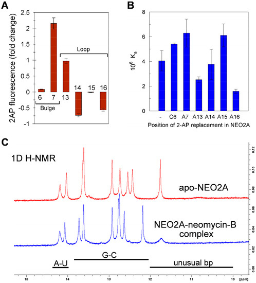 Unlike NEO1A, the secondary structure of NEO2A contains a 2-base internal bulge including the C6 and A7 residues. An increase in 2AP fluorescence was detected for the A7 position similar to A13, and no change in fluorescence was obtained for the 6th residue. Therefore, we think the interaction of aminoglycosides with NEO2A is an “induced fit” mechanism involving the pentaloop and the internal bulge and a driving force from ligand binding.