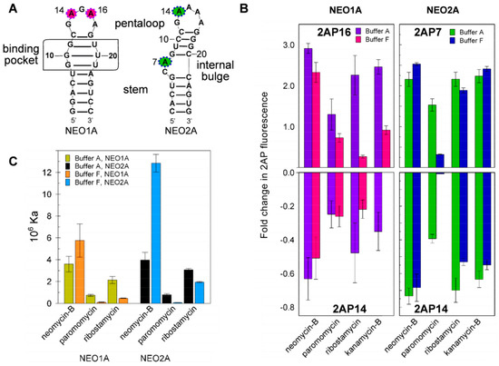 Despite evidence of a predominant structure for apo-NEO2A, interaction of the aptamer with ligand is expected to alter NEO2A structure as demonstrated for NEO1A (Figure 2). As well, the ionic environment profoundly influences the specificity of NEO1A for aminoglycosides [29,32]. NEO1A cradles its ligands in a structurally stable binding pocket with the loop bases responsive to buffer constituents [29]. For comparison, we tested the loop dynamics of NEO2A in Buffer F (in which these aptamers were selected), which is high ionic strength (I = 0.375 M), and Buffer A (formulated to resemble the salt concentrations in the mammalian cytosol), which is lower ionic strength (I = 0.185). As for NEO1A, the disposition of the mobile bases, established by changes in 2AP fluorescence, was influenced by ligand binding and buffer (Figure 4B). Thus, NEO2A and NEO1A both change in structure with ligand binding when monitored by 2AP reporters located in each of two positions (Figure 4B) and these structural changes are influenced by the ionic environment.