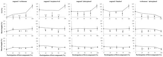 Effects of pairs of volatile compounds found in Ulex europaeus and Cytisus scoparius aerial biomass, assayed at fixed ratios, on the germination and early growth of Digitaria sanguinalis, expressed as percentages relative to the control (%). Values denote mean ± SD. The x-axis indicates the increasing participation of the first compound in the mixture (in percentage), i.e., 0, 3.1, 6.25, 9.4, and 12.5 ppm in the assayed volume. Dashed lines represent the expected effect of the two compounds acting independently [29]. Asterisks denote significant differences between observed and predicted values at * p ≤ 0.05; ** p ≤ 0.01; *** p ≤ 0.001; otherwise, not significant (p > 0.05).