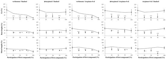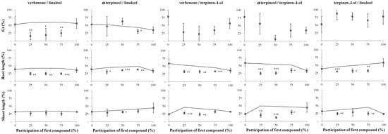 Effects of pairs of volatile compounds found in Ulex europaeus and Cytisus scoparius aerial biomass, assayed at fixed ratios, on the germination and early growth of Amaranthus retroflexus, expressed as percentages relative to the control (%). Values denote mean ± SD. The x-axis indicates the increasing participation of the first compound in the mixture (in percentage), i.e., 0, 3.1, 6.25, 9.4, and 12.5 ppm in the assayed volume. Dashed lines represent the expected effect of the two compounds acting independently [29]. Asterisks denote significant differences between observed and predicted values at * p ≤ 0.05; ** p ≤ 0.01; *** p ≤ 0.001; otherwise, not significant (p > 0.05).