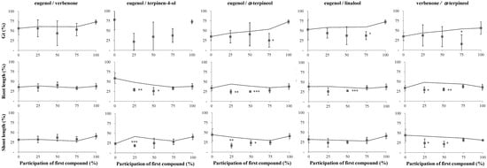 For the growth parameters measured on D. sanguinalis, all pairs at certain concentrations revealed significant deviations (p ≤ 0.05) below the predicted values, except for root length by eugenol/verbenone or shoot length by eugenol/verbenone, eugenol/linalool, and verbenone/linalool (Figure 3).