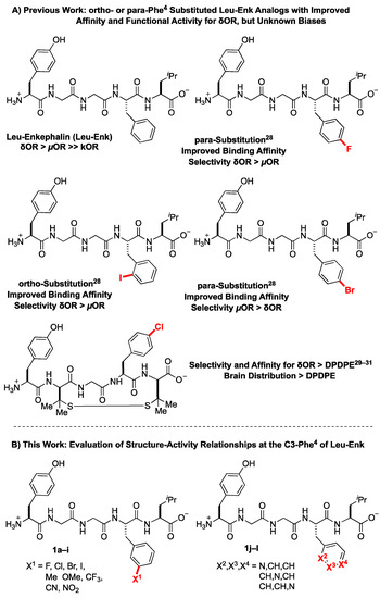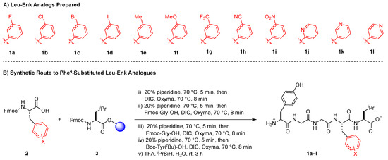 To probe the meta position of Phe4, we initially considered known structure-activity-relationship trends at the ortho and para positions of this residue. Considering that halogenated substituents at these positions perturbed binding affinity, δOR selectivity, and stability properties of the Leu5-enkephalin [28], we initially hypothesized that meta-halogenated analogs might similarly perturb the parent scaffold (Figure 3A, 1a–1d). An additional set of analogs bearing electron-donating (1e–1f) and -withdrawing groups (1g–1i) would further probe interactions at this site, including the electronic character of the Phe4 ring. Finally, pyridine analogs (1j–1l) would present H-bond accepting contacts about the ring, as well as provide analogs that present dipoles at similar vectors as to previously successful halogenated substituents.